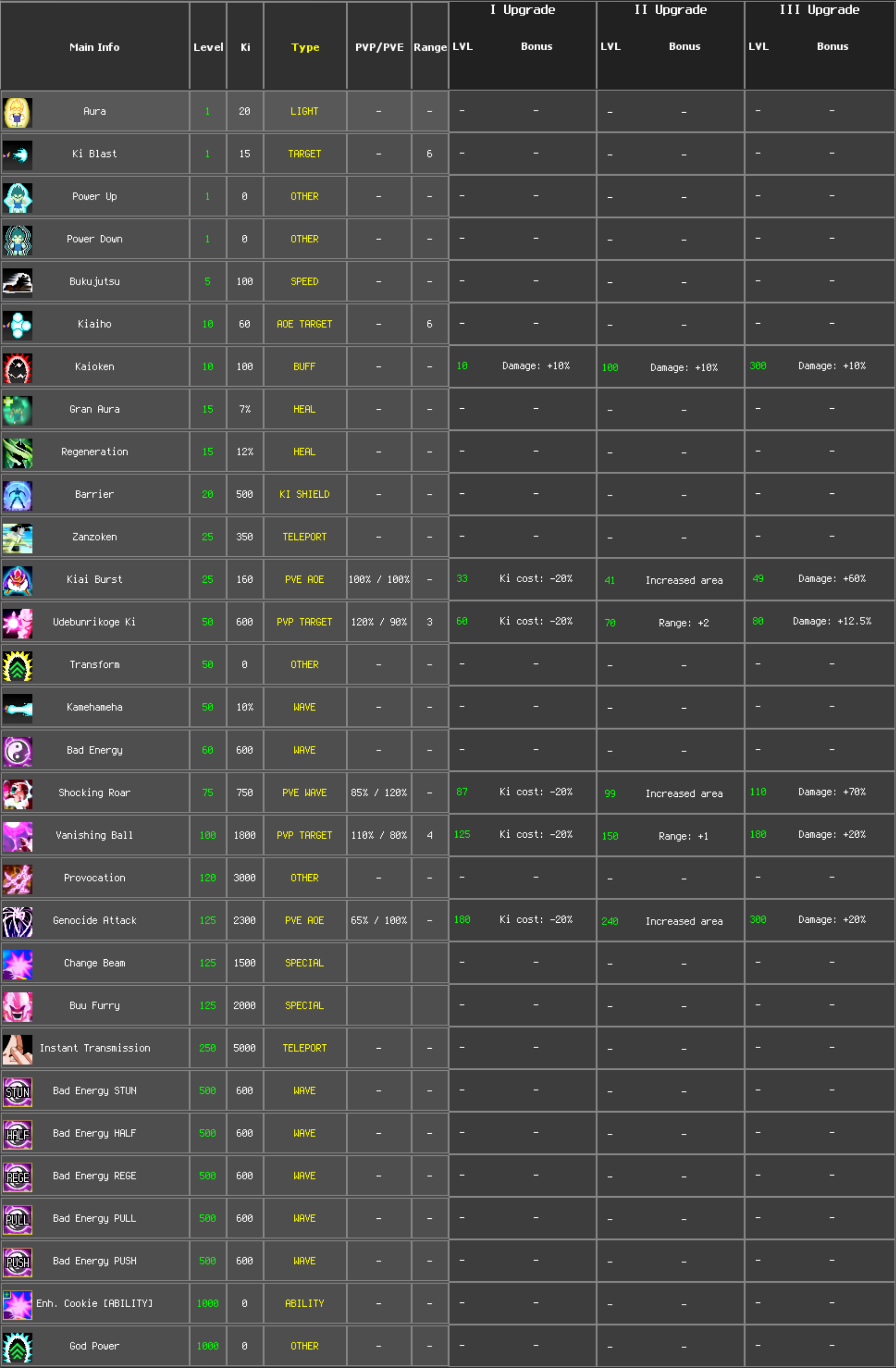 Buu: can change monsters in the cookies. Eaten cookie gives a random bonus: regeneration hp / ki: 20% or 100 rage for 1.5 sec